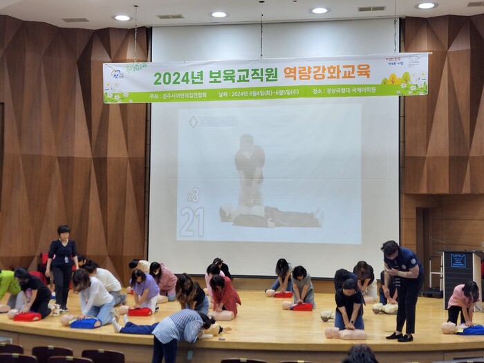 경상국립대학교 국제어학원에서 4일과 5일 이틀간 매일 2회씩 총 4회에 걸쳐 진행된 이번 교육은 보육교직원이 정기적으로 받아야 되는 의무교육으로 ▶어린이 안전 이론교육 ▶응급처치 및 심폐소생술 실습교육 ▶장애인식 개선교육 등 어린이 안전사고를 예방하고 대처할 수 있는 방법과 어린이집 내 응급상황 발생 시 신속한 응급처치 방법, 장애에 대한 인식개선 내용으로 진행되었다. 또한 안전사고를 사전에 예방하는 데 있어 보육교직원 역할의 중요성을 강조하는 시간이 되었다.