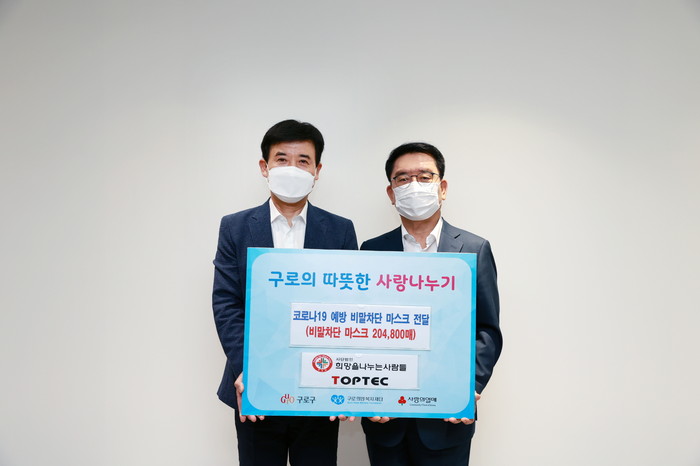 서울 구로구는 13일 사단법인 희망을 나누는 사람들과 (주)톱텍으로부터 코로나19 예방을 위한 KF-AD 비말차단 마스크 20만4800장을 후원받았다. 사진은 전달식에서 문헌일 구청장(오른쪽)이 관계자와 기념촬영을 하는 모습. (사진제공=구로구청)