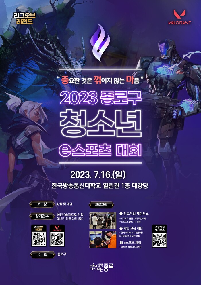 [시민일보 = 이대우 기자] 서울 종로구(구청장 정문헌)가 오는 16일 한국방송통신대학교 열린관에서 ‘2023 종로구 청소년 e스포츠 대회(부제: 중요한 것은 꺾이지 않는 마음)’를 개최한다.