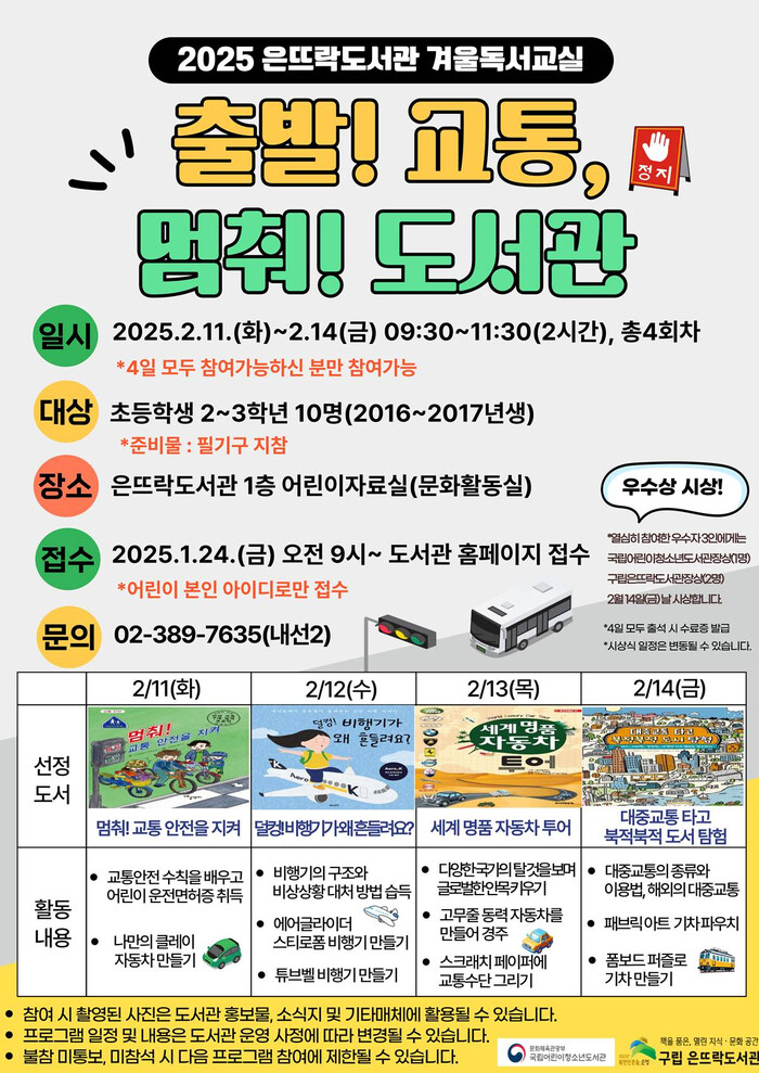 [시민일보 = 이대우 기자] 은평구(구청장 김미경)는 구립 은뜨락도서관에서 내달 11일부터 14일까지 ‘출발! 교통, 멈춰! 도서관’ 겨울 독서교실 프로그램을 운영한다고 밝혔다.
