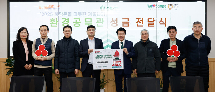 [시민일보 = 이대우 기자] 서울 송파구(구청장 서강석)가 최근 송파구 소속 환경공무관으로부터 ‘희망온돌 따뜻한 겨울나기’ 성금 300만원을 전달받고, 정년퇴임 공로패 수여식을 개최했다.