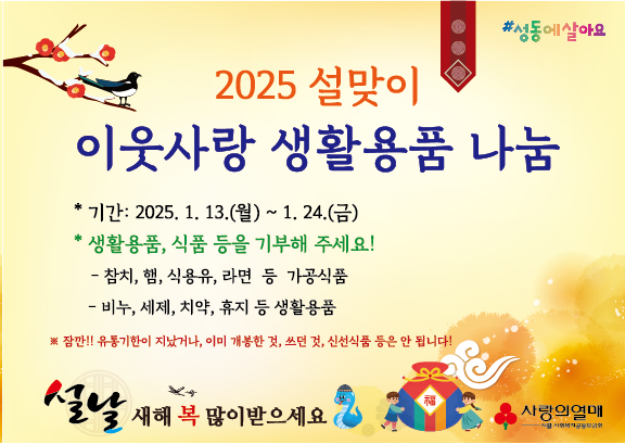 [시민일보 = 박소진 기자] 서울 성동구(구청장 정원오)는 설을 맞이해 명절 기간 소외된 이웃이 없이 훈훈한 명절을 보내도록 오는 24일까지 생활용품과 식료품을 기부하는 ‘설맞이 이웃사랑 생활용품 나눔’ 사업을 추진한다.