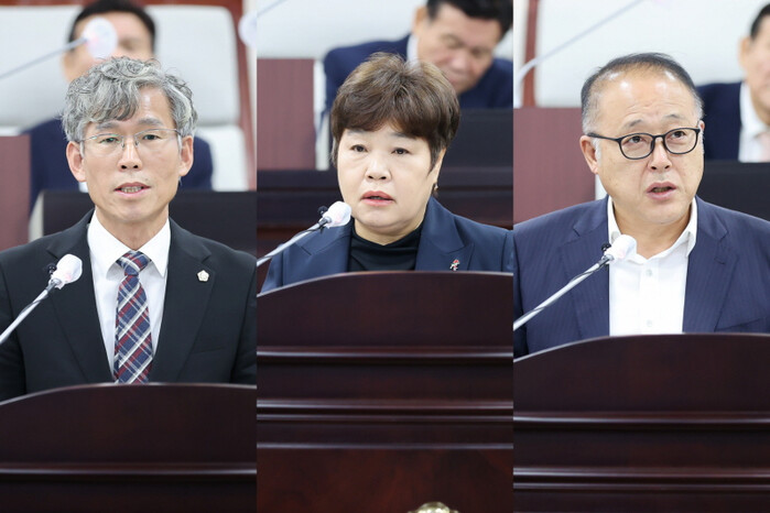 | 최훈·윤재실·원태근 의원이 자유발언 통해 지역 현안과 발전 방향에 대한 입장 밝히고 있다. |