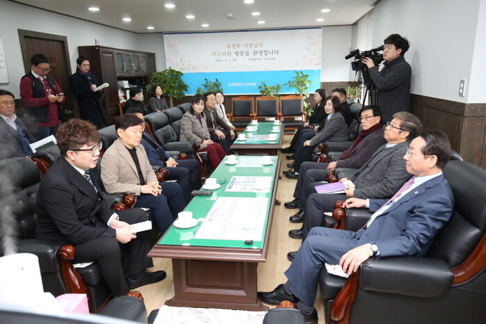| 송승환 의장과 서구의원들이 유정복 시장에게 예산·인사 문제에 대한 시 차원의 협조를 당부하고 있다. [사진=서구의회] |