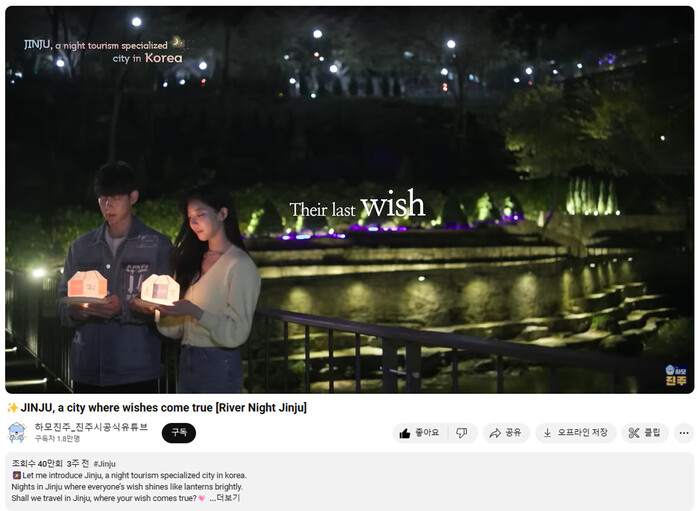 진주시가 제작한 야간관광 특화도시 홍보영상이 진주시 공식 유튜브 채널인 ‘하모진주'에서 조회수 61만을 기록하며 뜨거운 반응을 얻고 있다.