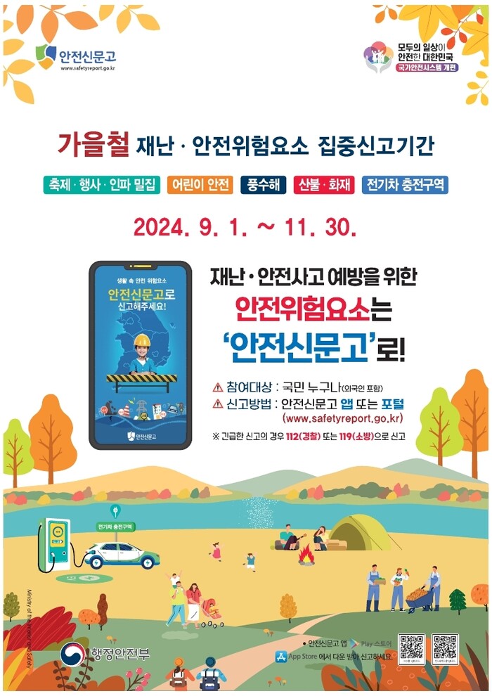 신고방법은 안전신문고 앱에서 ‘가을철 집중 신고’ 바로가기 메뉴만 선택하면 편리하게 신고가 가능하며, 조치 결과는 신고자에게 문자 메시지 등으로 안내한다.