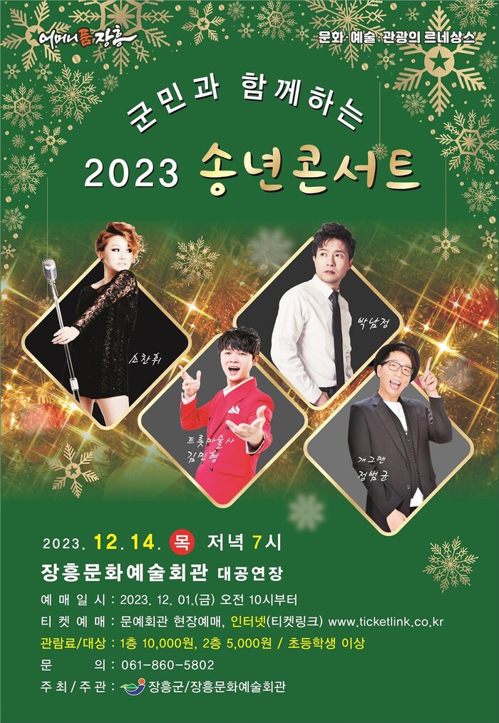 ‘송년콘서트’는 12월1일 오전 10시부터 장흥문화예술회관 현장예매와 인터넷 티켓링크를 통해 예매가 가능하다.