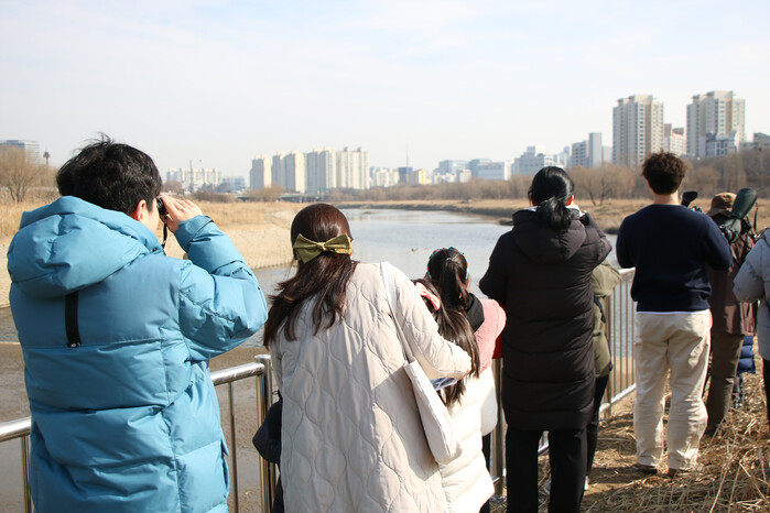 | ▲ 양천구, 안양천 철새 보호구역 생태쉼터를 탐조중인 구민들의 모습. (사진=양천구청 제공) |