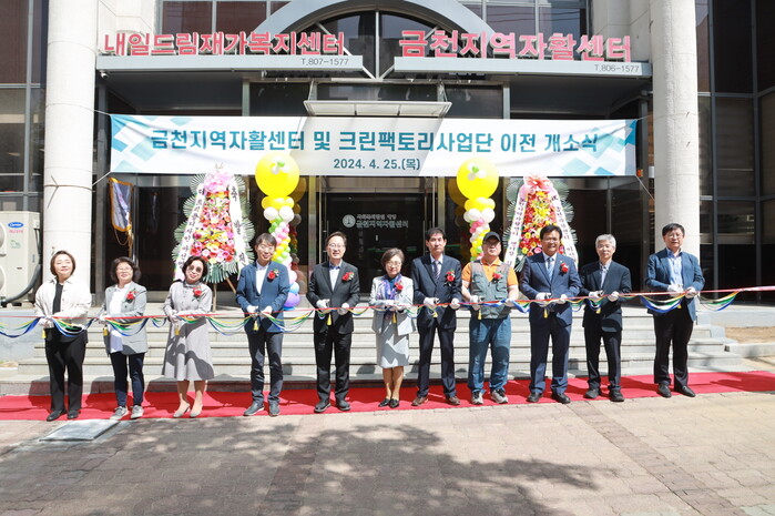 서울 금천구는 최근 금천지역자활센터에서 센터 사무실 및 자활근로사업단(크린팩토리) 이전 개소식을 진행했다. 사진은 유성훈 구청장(왼쪽 다섯 번째)이 개소식에서 테이프 커팅을 하고 있는 모습. (사진=금천구청 제공)