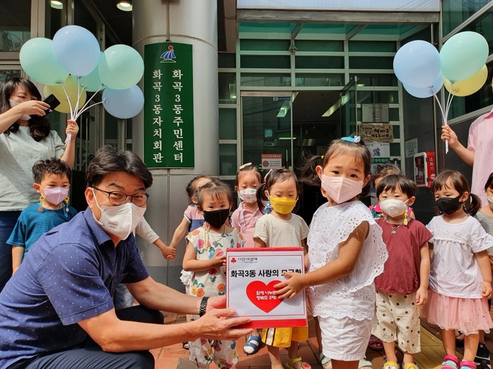 서울 강서구 화곡3동 주민센터는 22일 근로복지공단 강서어린이집으로부터 바자회를 통해 원생들이 마련한 수익금 50만원 전액을 기부받았다. 민족 대명절 추석을 앞두고 고사리손으로 건넨 기부금을 취약계층에 전달할 예정이다. 사진은 이날 전달식에서 한 어린이가 관계자에게 기부금을 전달하고 있는 모습. (사진제공=강서구청)