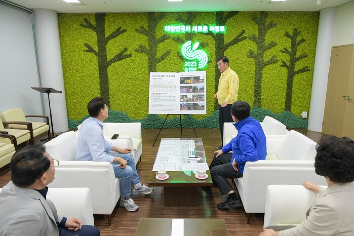 노관규 전남 순천시장과 소병철 국회의원이 지난 20일 순천 현안을 논의했다. 이번 만남은 기록적인 폭우로 발생한 순천 피해 상황 공유와 향후 대책 마련, 순천시 국고 예산 쟁점 공유 및 공동 대응 방안 수립을 위해 추진됐다. 사진은 노 시장(왼쪽)과 소 의원이 폭우로 발생한 순천 피해 상황을 공유하고 국고 예산 쟁점을 공유하는 모습. (사진=순천시청 제공)