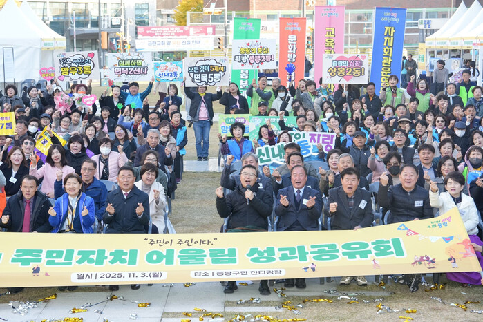 서울 중랑구가 지난 3~4일 이틀간 구청 잔디광장과 1층 로비, 지하 대강당에서 ‘제2회 중랑구 주민자치 어울림 성과공유회’를 개최한다. 사진은 성과공유회 행사에 참석한 류경기 구청장과 관계자들의 모습. (사진=중랑구청 제공)