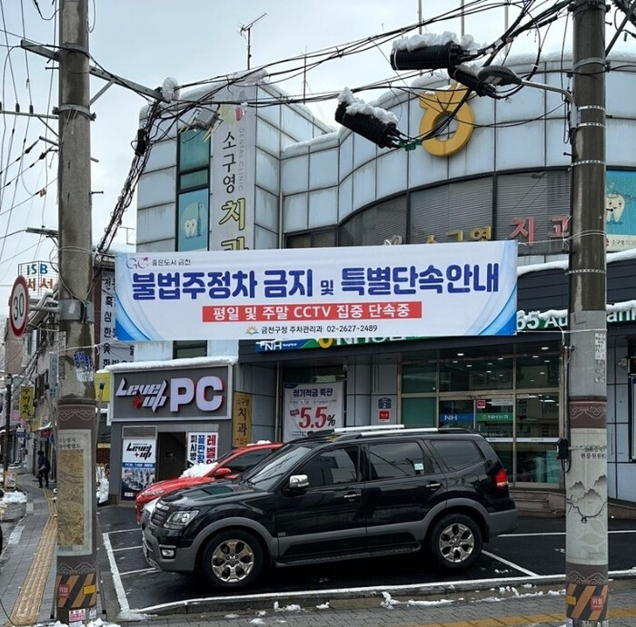| ▲ 불법 주‧정차 특별단속 현수막이 관내 곳곳에 걸려 있다. (사진=금천구청 제공) |