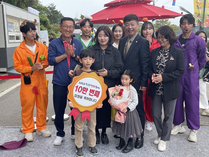 10만 번째 관람객에게 축하 인사를 전한 최재호 농업정책위원회 위원장은 “올해는 축제추진위원회에서 외부주차장을 모두 축제장 부근에 확보해 6개 주차장 통제가 수월해져 작년보다 교통상황이 나아진 점이 벌써 입소문을 타기 시작한 거 같다”며 “그래도 관람객이 많이 몰리는 휴일 정오부터 오후 세시 경은 피해서 방문하시는 것이 편안한 관람에 도움이 될 것”이라고 당부했다.