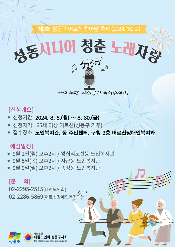 [시민일보 = 이대우 기자] 서울 성동구(구청장 정원오)가 노인이 함께 웃고 즐기는 축제의 장 ‘성동시니어 청춘 노래자랑’의 참가자를 모집한다.