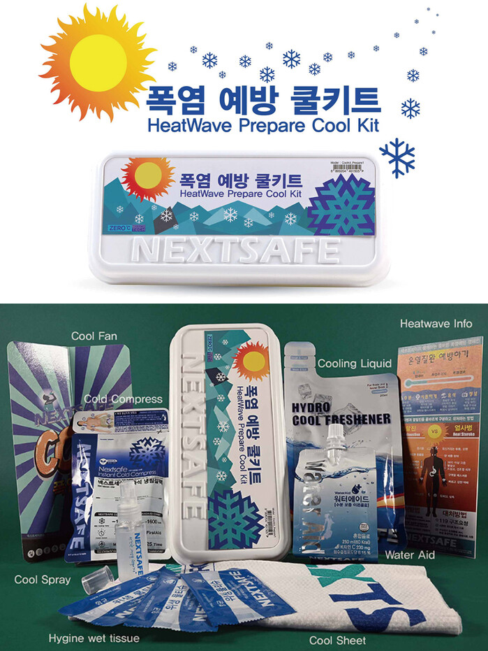 한편 폭염 예방 쿨키트 출시 이벤트로 온열 질환 교육과 폭염 캠페인을 위한 문구와 기관 및 기업로고 인쇄를 무상으로 지원하고 있다. ㈜넥스트세이프 대표번호로 연락시 제품 문의 및 폭염 온열 질환 예방 교육/캠페인 인쇄에 대한 자세한 문의가 가능하다.
