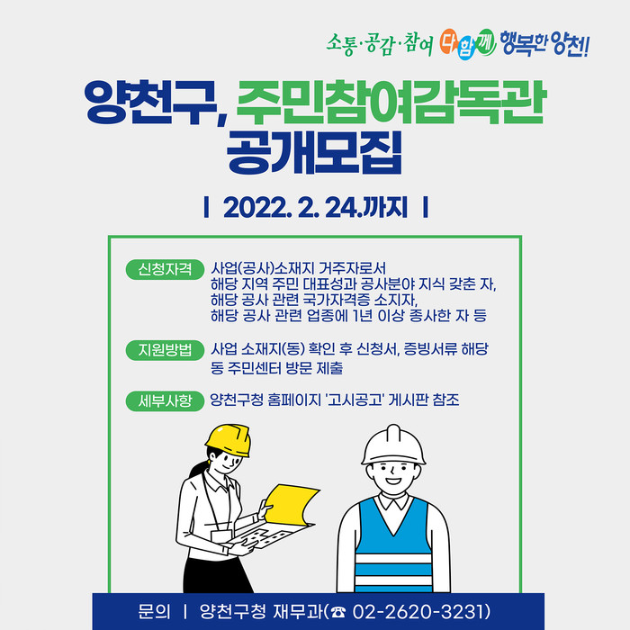 [시민일보 = 이대우 기자]서울 양천구(구청장 김수영)가 오는 24일까지 지역내 도로포장 등 7개 공사에 '주민참여감독관'으로 참여할 12명을 공개 모집한다고 밝혔다.