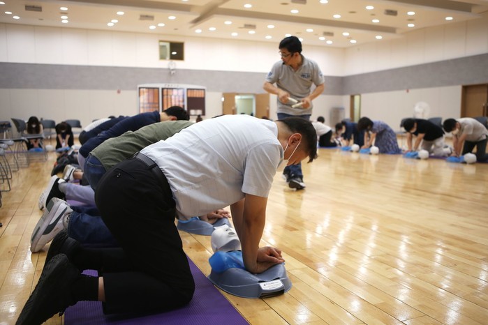 서울 은평구는 위급상황 발생에 적극 대응할 수 있도록 오는 9월14일까지 65회차에 걸쳐 응급처치 전문기관인 한국 라이프세이빙 소사이어티에서 전직원 대상 심폐소생술과 자동제세동기 사용법 교육을 실시한다. 사진은 26일 진행된 교육에서 은평구 직원둘이 심폐소생술을 실습하고 있는 모습. (사진제공=은평구청)