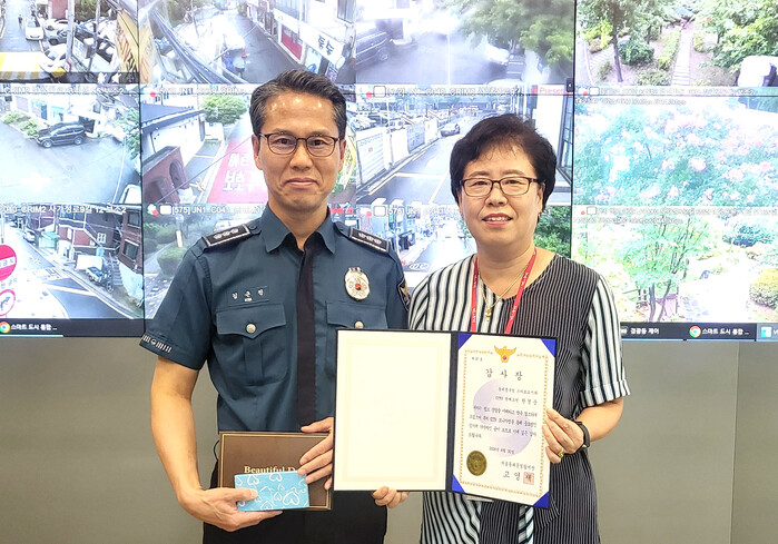 [시민일보 = 이대우 기자] 서울 동대문구(구청장 이필형) 폐쇄회로(CC)TV 통합관제센터에서 근무하는 관제요원 A씨가 살인미수 피의자 검거에 기여한 공로로 동대문경찰서로부터 감사장을 받았다.