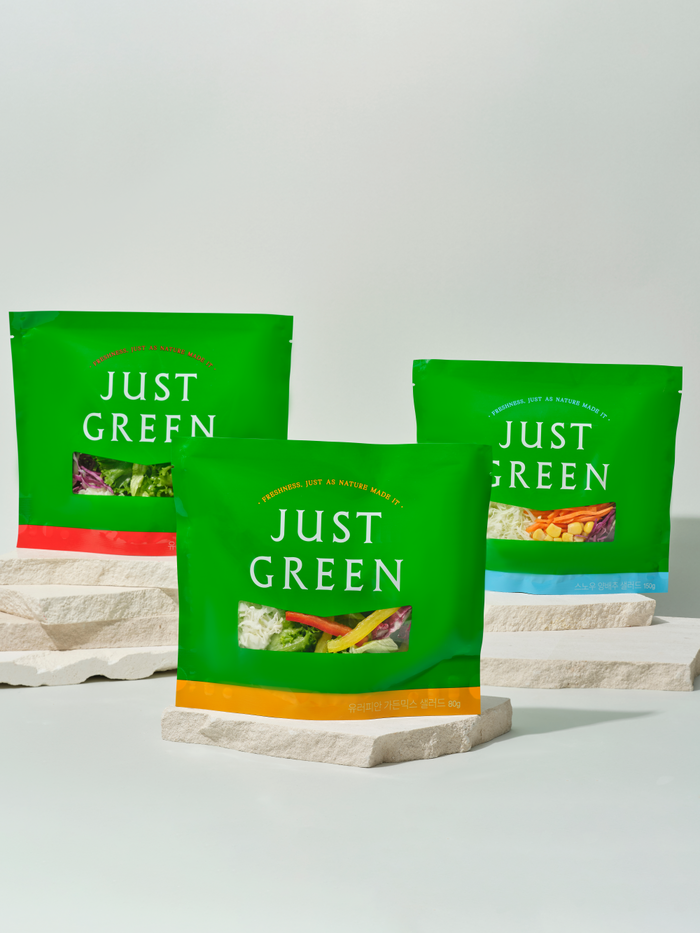 저스트그린의 유러피안 샐러드는 PAA(Peroxyacetic Acid) 세척 공정을 거쳐 별도의 세척 없이 바로 섭취 가능한 RTE(Ready-to-Eat) 제품이다. 또한 스탠딩 파우치형 패키지로 보관 편의성과 섭취 용이성을 확보하였으며 전 공정에서 저온 유통 체계를 유지해 수확 이후 신선도를 장시간 보존할 수 있도록 했다.