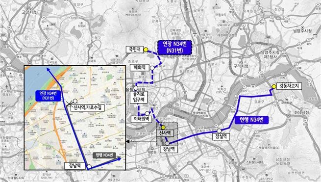 ‘N34’번은 강동공영차고지에서 신사역까지 운행하는 심야버스로, 이번 노선 연장으로 노선 번호가 변경되며, 운행대수는 4대, 운행횟수가 총 8회로 증가, 배차간격이 35~40분으로 감소한다.