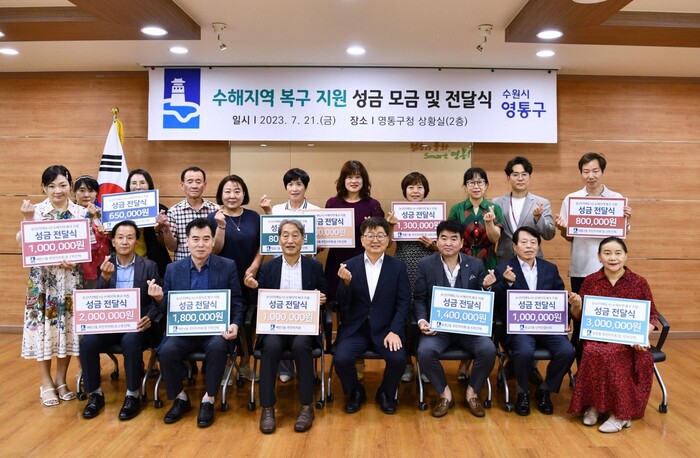 경기 수원시 영통구는 최근 12개동 주민자치회, 통장협의회 등 40여개의 단체 등으로부터 집중호우 피해지역 이재민을 돕기 위한 2230만원 상당의 성금을 전달받았다. 성금은 집중호우로 피해를 입은 수원시 자매도시인 논산시로 전달돼 이재민 지원 등에 사용될 예정이다. 사진은 전달식에서 김용덕 구청장(앞줄 가운데)과 관계자들이 기념촬영을 하고 있는 모습. (사진=영통구청 제공)