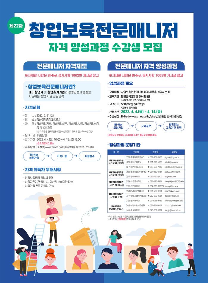 창업보육전문매니저 자격 양성과정은 예비창업자 및 창업초기 기업의 경영 안정과 성장지원을 위한 창업지원 전문 인력 양성을 배출하기 위해 마련되었으며 2022년 제 22차 창업보육전문매니저 자격시험을 준비하는 수험생의 부담을 경감시키고 우수 인력을 조기에 확보하는데 교육 목표가 있다.
