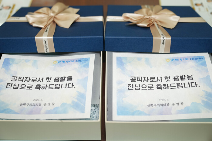 [시민일보 = 이대우 기자] 서울 은평구의회(의장 송영창)가 최근 열린 2025년 신규 공무원 임용장 수여식에서 새내기 공무원 2명에 대해 임용장과 웰컴키트를 전달하며 공직생활 입문을 환영했다.