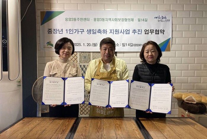 [시민일보 = 이대우 기자] 은평구(구청장 김미경) 응암3동은 지난 20일 지역사회보장협의체와 응암동 소재 제과점 밀14길과 ‘중장년 1인가구 생일축하 지원사업’ 추진을 위한 업무협약을 체결했다고 밝혔다.