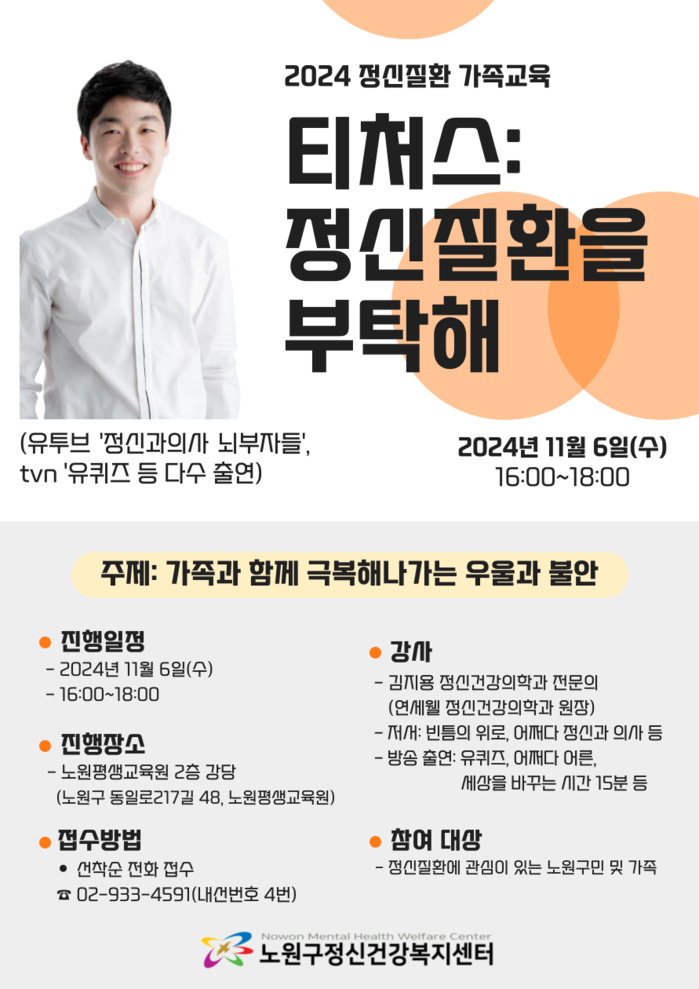 [시민일보 = 박소진 기자] 서울 노원구(구청장 오승록)가 26일부터 정신질환 가족교육 ‘티처스: 정신질환을 부탁해’ 참여자를 모집한다.