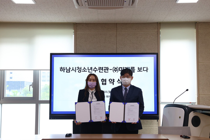 경기 하남시청소년수련관은 최근 (주)미래를보다와 업무협약을 체결하고, 청소년의 올바른 성장 발달을 위한 지원협력을 약속했다. 협약의 주요내용은 청소년의 건강한 성문화 확산을 위한 프로그램 지원 등이다. 사진은 협약식에서 관계자들이 기념촬영을 하는 모습. (사진제공=하남시청)