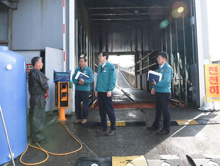 [영암=정찬남 기자] 우승희 전남 영암군수가 지난 10월31일 ‘소 럼피스킨병’의 전국 확산 조짐에 따라 거점소독시설을 방문하고, 농가에 5일까지 신속한 백신 접종 완료를 당부하는 등 영암군 유입 방지를 위해 현장 점검을 실시했다.