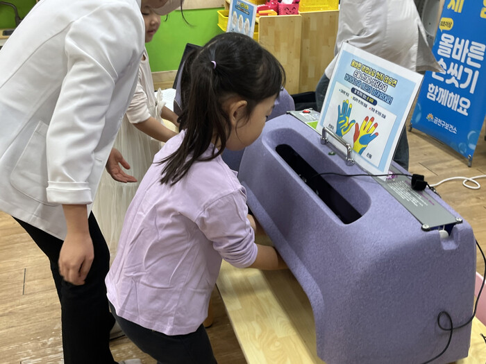 | ▲ 아이가 형광램프를 이용해 손 씻기 체험을 하고 있다. (사진=금천구청 제공) |