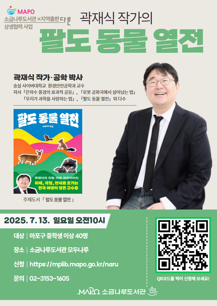 [시민일보 = 문민호 기자] 서울 마포구(구청장 박강수)는 오는 13일 소금나루도서관 모두나루에서 중학생 이상 구민 40명 대상으로 ‘곽재식 작가의 팔도 동물 열전’ 강연을 개최한다.