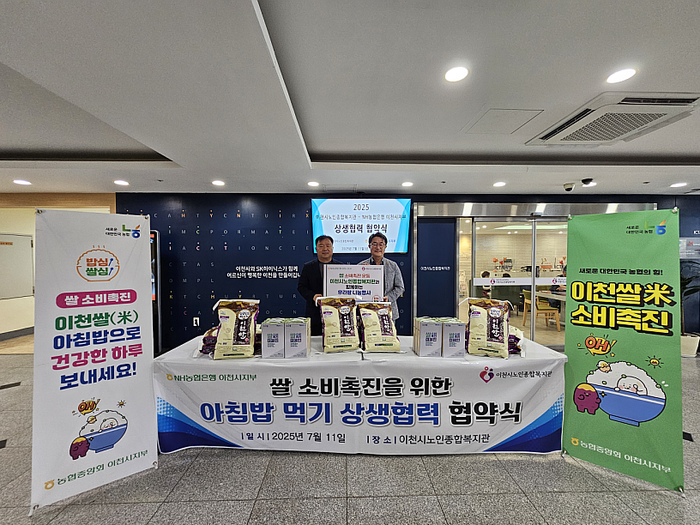 경기 이천시노인종합복지관이 4일 농협은행 이천시지부로부터 이천쌀 소비 촉진을 위한 상생협력의 일환으로 이천쌀 10kg 51포를 기탁받았다. 사진은 기탁식에서 관계자들이 기념 촬영을 하는 모습. (사진=이천시청 제공)