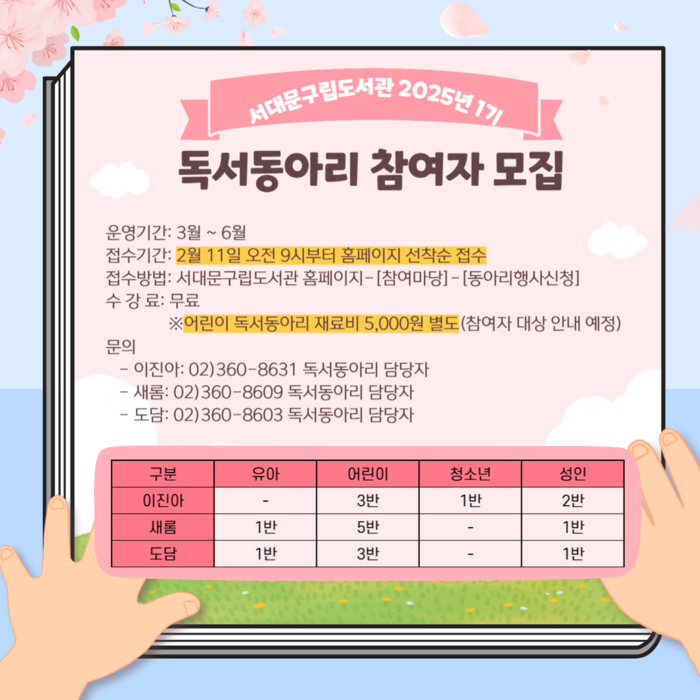 [시민일보 = 이대우 기자] 서대문구도시관리공단(이사장 한운영)이 운영하는 서대문구립도서관에서 오는 3월부터 6월까지 4개월 동안 어린이, 청소년, 성인을 대상으로 하는 2025년 제1기 독서동아리 회원을 모집한다. 이진아기념도서관, 홍은도담도서관, 남가좌새롬어린이도서관 3개관에서 2월 11일 오전 9시부터 도서관 홈페이지에서 선착순으로 접수로 진행된다.