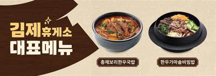 김제휴게소는 지역 특산물을 활용해 메뉴 경쟁력을 갖춘 것이 특징이다. 전라북도 지역의 대표 특산물인 ‘지평선 쌀’과 ‘총체보리한우’를 활용해 △총체보리한우국밥(11,000원) △한우가마솥비빔밥(11,000원) 등 특화 메뉴를 제공하며, 당일 도정한 쌀로 차별화된 식사를 선보인다.