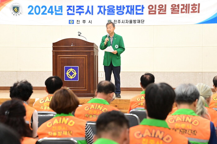 조규일 진주시장이 지난 9일 지역자율방재단 월례회의에 참석해 각종 재난 대응 활동에 대한 의견을 수렴하고 시민의 안전을 위해 힘쓰고 있는 임원들을 격려했다.