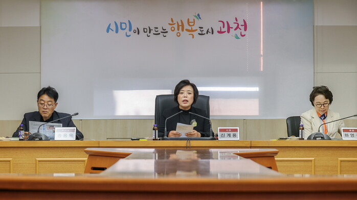 경기 과천시가 최근 시청 상황실에서 ‘민간데이터를 활용한 빅데이터 분석 사업’ 최종 보고회를 개최했다. 사진은 신계용 시장(가운데)이 민간데이터를 활용한 빅테이터 분석사업 최종보고회에서 발언하는 모습. (사진=과천시청 제공)
