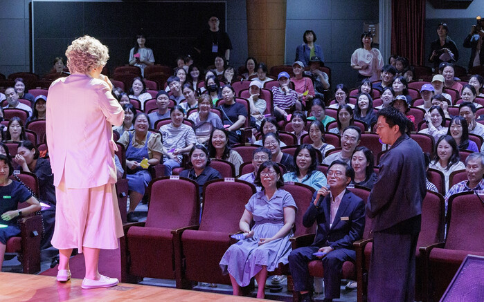 진교훈 서울 강서구청장이 17일 강서구민회관에서 열린 육아 고민 발산 토크쇼 ‘소통왕 말자 할매’에 참석해 양육자의 고민을 함께 나눴다. 사진은 진 구청장이 말자 할매(개그우먼 김영희)와 대화하는 모습. (사진=강서구청 제공)