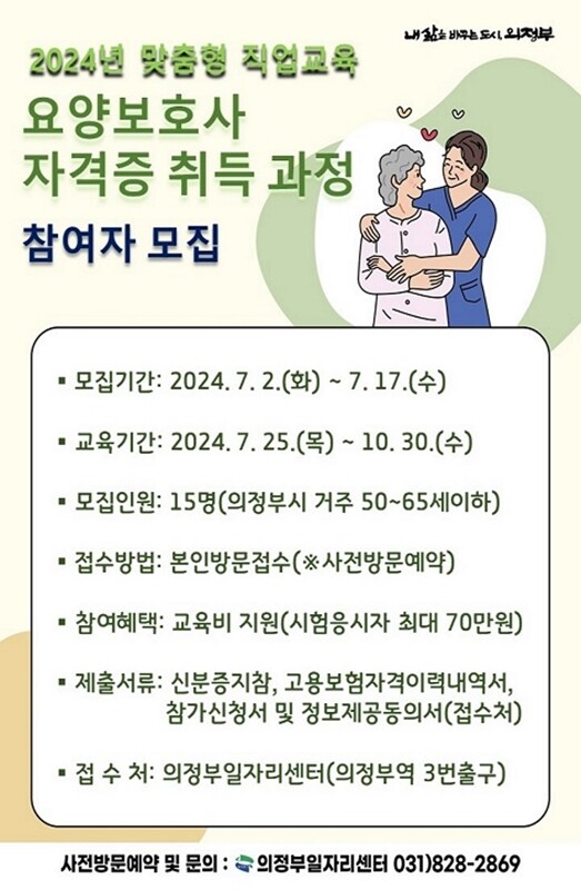 [시민일보 = 민장홍 기자] 경기 의정부시가 맞춤형 직업교육 취업프로그램 ‘요양보호사 자격증 취득과정’에 참여할 구직자를 모집한다.