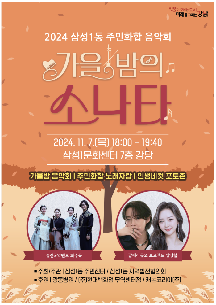 [시민일보 = 이대우 기자] 서울 강남구(구청장 조성명) 삼성1동이 오는 7일 삼성1문화센터 7층 강당에서 ‘가을밤의 소나타’를 개최한다.