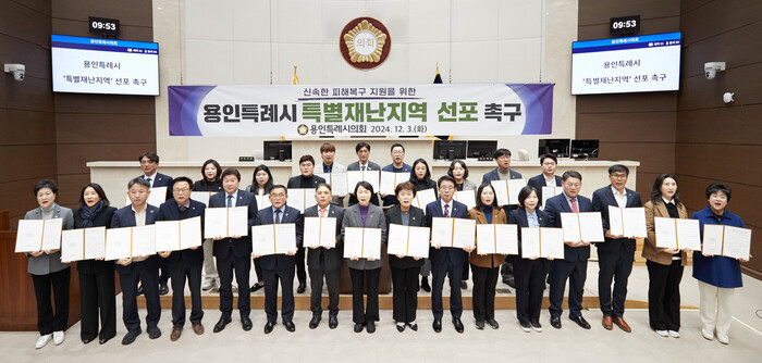 이어, "피해복구와 극복을 위해 민·관이 협력해 가용 가능한 모든 힘을 총동원해 대처하고 있는 용인 시민들의 의지에 용인특례시의회도 뜻을 함께하며 신속한 지원 대책 수립을 위해 특별재난지역 선포를 촉구한다"고 말했다.