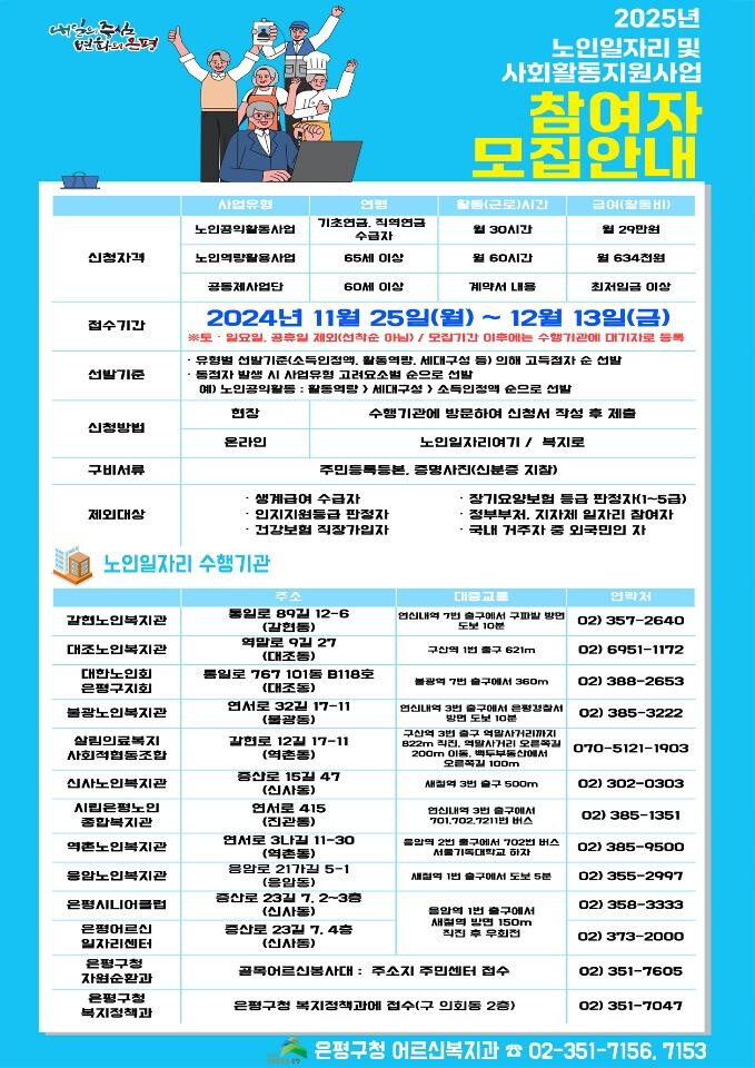 | ▲ ‘2025년 노인일자리 및 사회활동자지원사업 참여자 모집안내’ 포스터. (사진=은평구청 제공) |