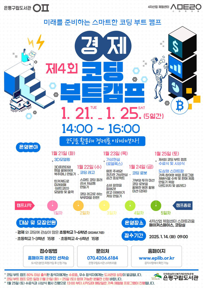 강현구 은평구립도서관장은 “겨울방학 코딩 부트 캠프는 경제와 코딩을 함께 배우며 창의적이고 논리적인 사고를 기를 수 있는 프로그램이다”며 “학생들이 다양한 체험을 통해 경제적 사고를 키우고 코딩 기술을 실생활에서 어떻게 활용할 수 있을지에 대한 통찰을 얻길 바란다”고 말했다.