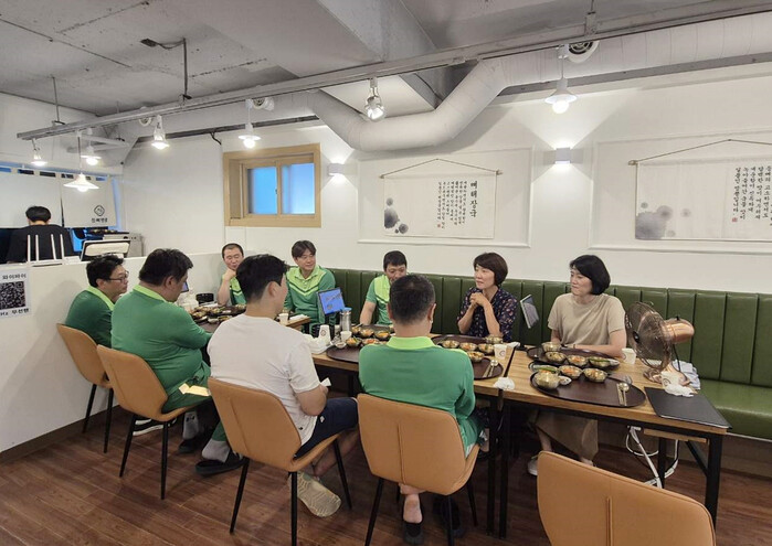 5일 경기 수원시 팔달구 화서1동 환경관리원 쉼터에서 새빛 환경수호자인 환경관리원과 시민이 함께 참여해 생활쓰레기 감량에 대한 논의를 진행했다. 사진은 회의가 진행 중인 모습. (사진=팔달구청 제공)