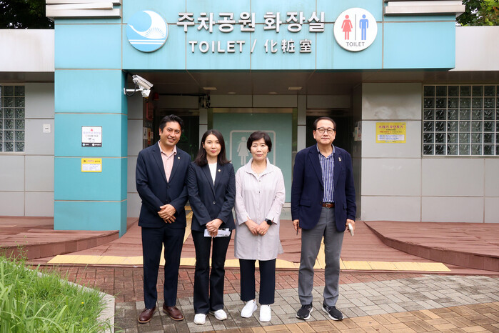 | ▲ 공중화장실 점검에 나선 (왼쪽부터) 정세열, 이영주, 김효숙, 장순욱 의원의 모습.(사진=동작구의회 제공) |