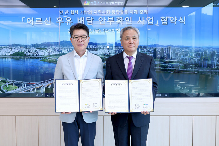 이번 협약은 성동구 지역에서 시작돼 전국적으로 확산된 ‘어르신 안부를 묻는 우유배달’ 23주년을 기념해 사업의 의미를 되새기고, 민·관이 함께 보다 촘촘한 돌봄 안전망을 구축하고자 추진됐다.