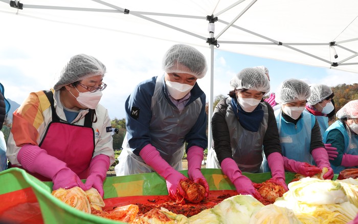 서울 관악구는 11일 관악구 자원봉사센터와 함께 2021년 ‘김장과 나눔의 날’ 행사를 개최해 김장김치 총 1300여kg을 담가 관악구 21개동 자원봉사캠프를 통해 지역내 저소득층 부자(父子) 가정 350여가구에 전달했다. 사진은 행사에 참여한 박준희 구청장(왼쪽 두 번째)가 봉사자들과 김장을 하고 있는 모습. (사진제공=관악구청)