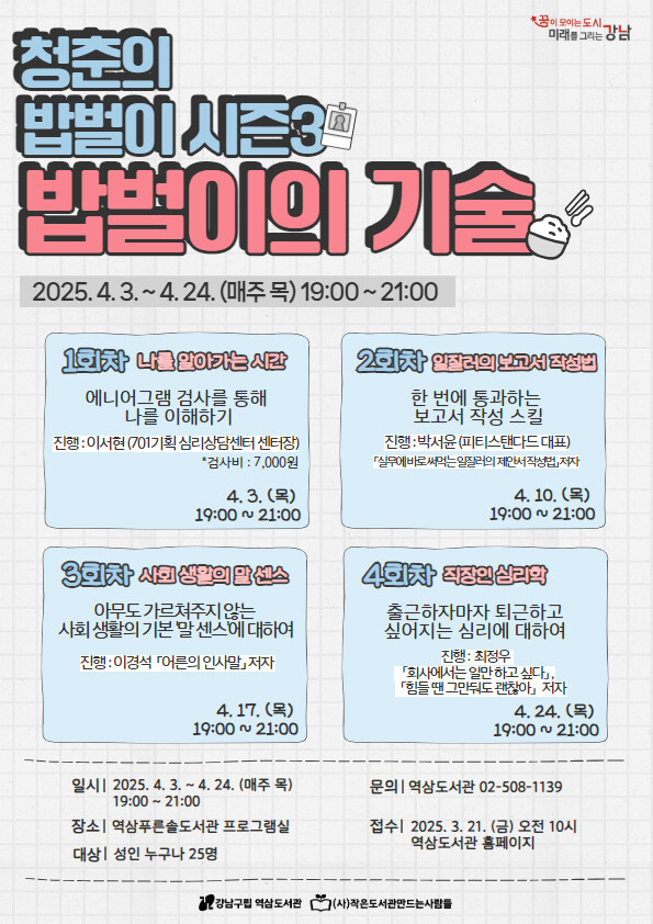 [시민일보 = 이대우 기자] 강남구립역삼도서관은 4월 3일(목)부터 4월 24일(목)까지 매주 목요일 저녁 7시~9시 총 4회에 걸쳐 <청춘의 밥벌이시즌3_밥벌이의 기술>을 진행한다. 이번 프로그램은 지역 특성을 고려한 직장인 특화 프로그램의 일환으로 실제 업무에 도움이 되는 것들을 주제로 다양한 업무 스킬을 습득하고, 직장 생활의 만족도를 높일 수 있도록 돕고자 기획되었다.